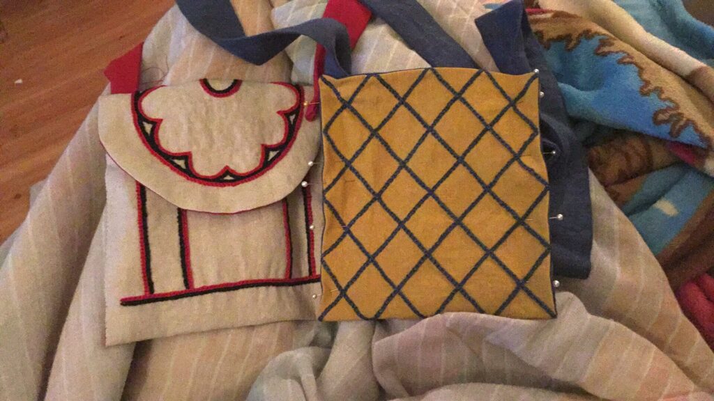 I added long shoulder straps in the lining fabric, as shown in the manuscripts. The strap ends were doubled over to create a smaller footprint when attached to the pouches. The red ones were sewn to the back, and the blue ones were inserted into the pouch and sewn to the lining. I’m really pleased with the way they came out and I want to make a million more of them.