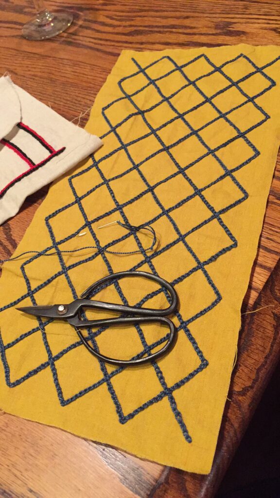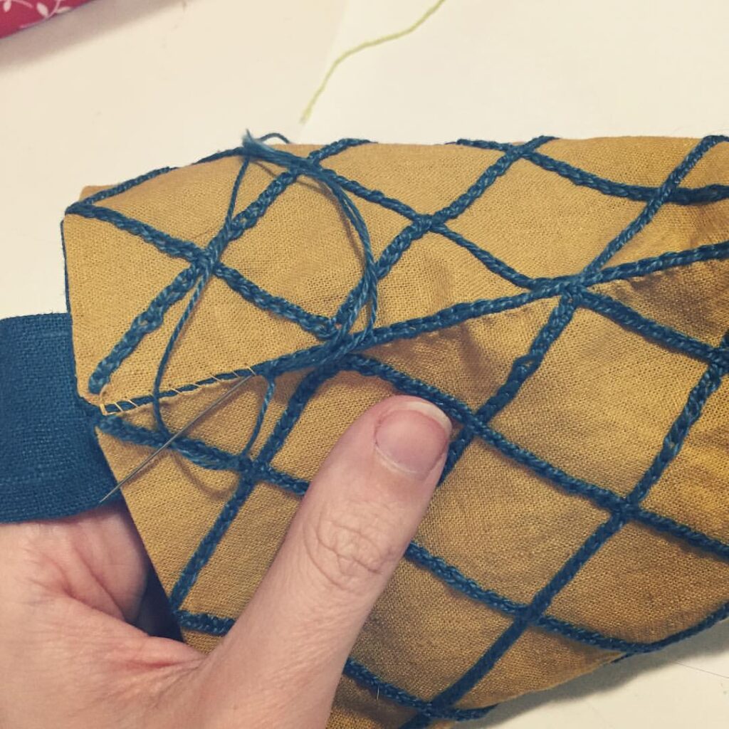 When last we left our project, I’d finished up the embroidery on the first pouch, and I’d sketched out the diamonds on the yellow linen (the last of the linen from my Byzantine dress [have I seriously not blogged that either?! What is WRONG with me?], except for what I’ve held back for lining the cuffs, whenever they get finished).