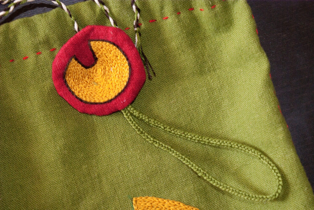 The design for the pouch was taken from Kievan temple-brooches from the relevant period. Most of them show animals or saints mirrored. I went with foxes, since the recipient listed those as favorites. Embroidered in split and chain stitch with DMC cotton floss.