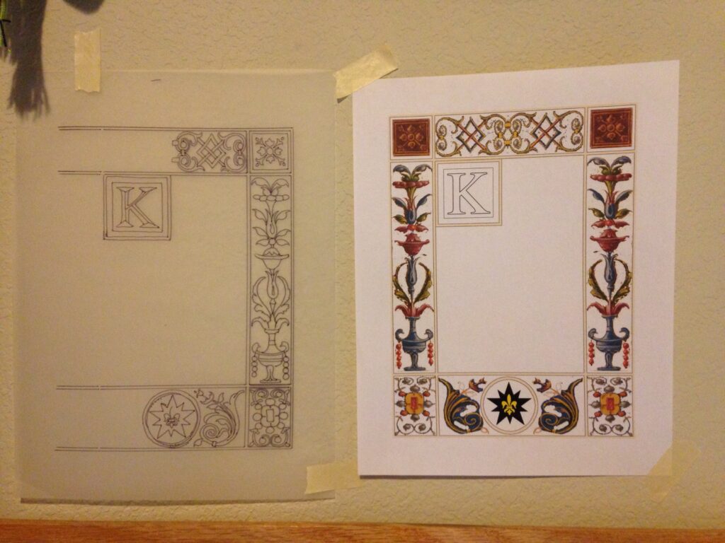 Not shown: taking ideas from several leaves of the Book and sketching them out on graph paper to get the proportions right within my space limitation. I then brought the images into photoshop to get everything the way I wanted and mirrored without a whole ton of problems. Then I traced the image onto tracing paper so I could easily transfer it to the final working paper.