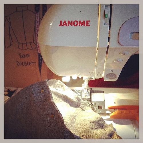 Just a couple shots of a new doublet in the works. Well, it was new when I was making it… In May. It’s finished now, but I wanted to show the in-progress shots first, especially the attempt at a pad-stitched collar. I’m pretty happy with the way it came out; it added a lot of stability to the finished product.